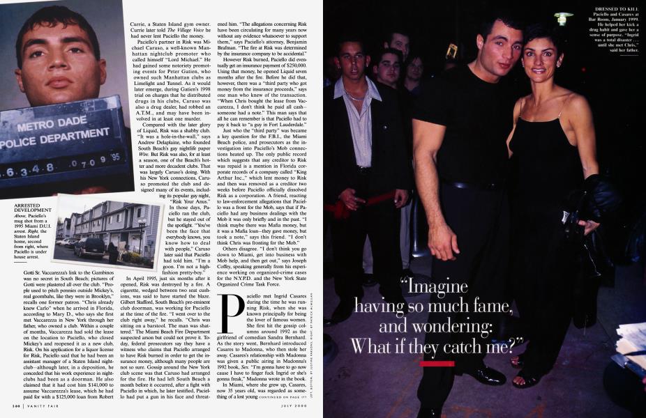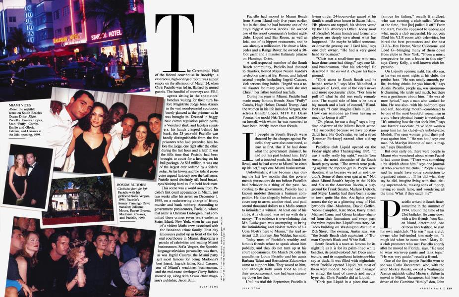 July 2000 Suzanna AndrewsWhen Chris Paciello—handsome young lord of Miami nightlife, friend of Madonna, Ingrid Casares, and Jennifer Lopez, millionaire owner of Joia, Liquid, and Bar Room—was charged with racketeering for murder and bank robbery last December, his dazzled supporters called it a shame that his New York past was catching up with him. But from F.B.I. wiretaps, police sources, and South Beach insiders, SUZANNA ANDREWS reveals the full scope of the case against Paciello: prosecutors say that he owed his glittering business, 50-foot yacht, and waterfront palazzo to Mafia backing, and that a cold-blooded 1993 killing in Staten Island was prelude to a hot new life of clubs and crime