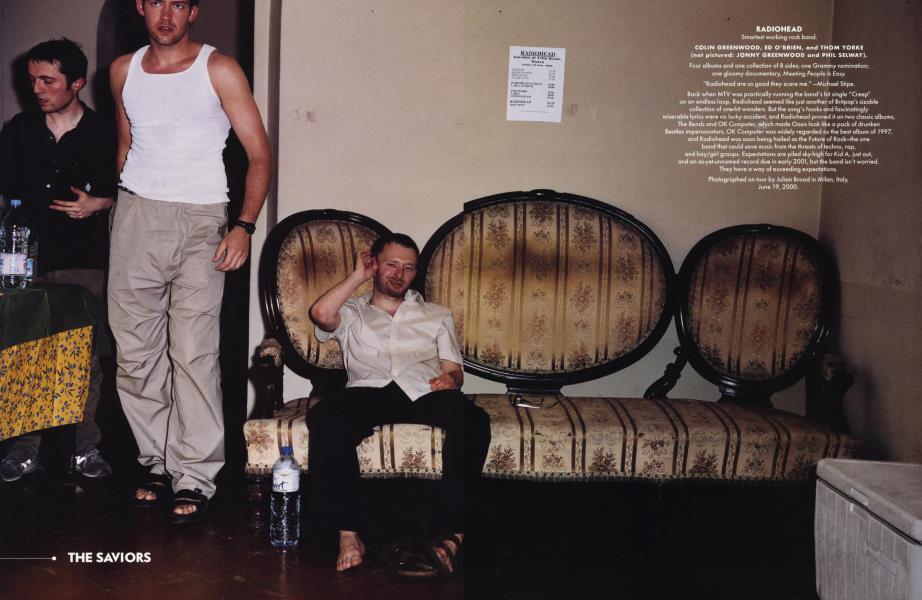 Back when MTV was practically running the band's hit single "Creep" on an endless loop, Radiohead seemed like just another of Britpop's sizable collection of one-hit wonders. But the song's hooks and fascinatingly miserable lyrics were no lucky accident, and Radiohead proved it on two classic albums, The Bends and OK Computer, which made Oasis look like a pack of drunken Beatles impersonators. OK Computer was widely regarded as the best album of 1997, and Radiohead was soon being hailed as the Future of Rock—the one band that could save music from the threats of techno, rap, and boy/girl groups. Expectations are piled sky-high for Kid A, just out, and an as-yet-unnamed record due in early 2001, but the band isn't worried.