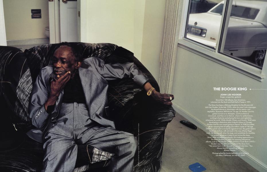 The blues has been a lifelong discipline for the 83-year-old John Lee Hooker. In the late 1920s, when he wasn't yet a teenager, he played dances in Mississippi with his mentor and stepfather, bluesman Will Moore. At age 14, Hooker (and his guitar) moved on to Memphis, and from there to Cincinnati, and then on to Detroit, where he settled down, working in factories and playing the bars and nightclubs whenever he could. While Muddy Waters and Howlin' Wolf were developing a distinctive style of electric blues in Chicago, Hooker had his own sound going in Detroit. In 1948 he pulled off the amazing feat of selling one million copies of "Boogie Chillen," which went on to be his signature tune. His guitar style is hard and rhythmic, with not much in the way of fancy finger work. He likes to talk when he sings, and sometimes he mumbles or moans—whatever it takes to put across the deep blues. After countless comebacks—his riveting appearance in The Blues Brothers in 1980; his amazing late-period albums, such as The Healer (1989) and Don't Look Back (1997)—Hooker says he still hasn't mastered the blues form. You never learn it all," he said in a recent interview. "You always learnin' something different. Always learnin'."