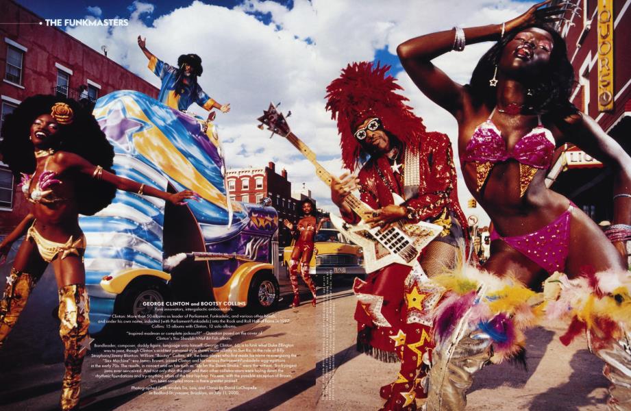 Bandleader, composer, daddy figure, language unto himself: George Clinton, 60, is to funk what Duke Ellington was to jazz, though Clinton's acid-test personal style shows more affinity to Sun Ra. In the role of Billy Strayhorn/Jimmy Blanton: William "Bootsy" Collins, 49, the bass player who first made his name re-energizing the "Sex Machine" era James Brown, joined Clinton and his various Parliament-Funkadelic aggregations in the early 70s. The results, in concert and on hits such as "Up for the Down Stroke," were the wittiest, 'fro-fryingest jams ever conceived. And not only that: the pair.and their other collaborators were laying down the rhythmic foundations and fry anything ethos of the best hip-hop. No one, with the possible exception of Brown, has been sampled more—is there greater praise?