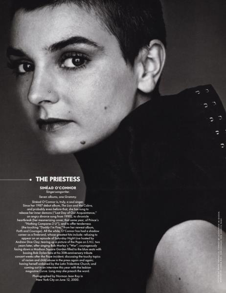 Sinead O'Connor is, truly, a soul singer. Since her 1987 debut album, The Lion and the Cobra, and probably even before that, she has sung to release her inner demons ("Last Day of Our Acquaintance," an angry divorce song from 1990), to chronicle heartbreak (her mesmerizing cover, that same year, of Prince's "Nothing Compares 2 U"), and to offer tenderness (the touching "Daddy I'm Fine," from her newest album, Faith and Courage). All the while, O'Connor has had a shadow career as a firebrand, whose greatest hits include: refusing to appear on an episode of Saturday Night Live hosted by Andrew Dice Clay; tearing up a picture of the Pope on S.N.L. two years later, after singing Bob Marley's "War"; courageously facing down a Madison Square Garden filled to the blue seats with booing Bob Dylan fans at his 30th-anniversary tribute concert weeks after the Pope incident; discussing the touchy topics of racism and child abuse in the press again and again; having herself ordained by the Latin Tridentine Church; and coming out in an interview this year with the lesbian magazine Curve. Long may she preach the word.