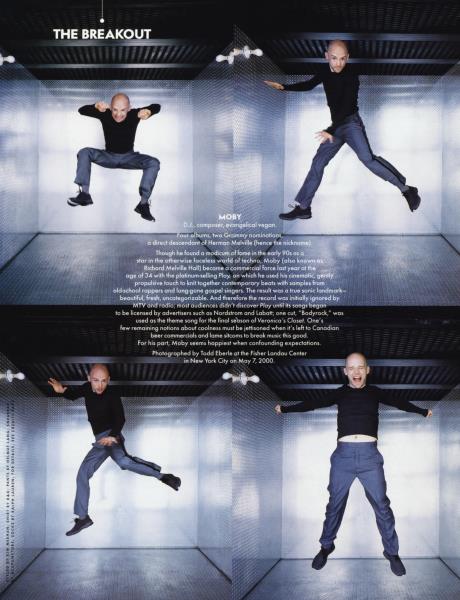 Though he found a modicum of fame in the early 90s as a star in the otherwise faceless world techno, Moby (also known as Richard Melville Hall) became a commercial Force last year at the age of 34 with the platinum-selling Play, on which he used his cinematic, gently propulsive touch to knit together contemporary beats with samples from old-school rappers and long-gone gospel singers. The result was a true sonic landmark—beautiful, fresh, uncategorizable. And therefore the record was initially ignored by MTV and radio; most audiences didn't discover Play until its songs began to be licensed by advertisers such as Nordstrom and Labatt; one cut, "Bodyrock," was used as the theme song for the final season of Veronica's Closet. One's few remaining notions about coolness must be jettisoned when it's left to Canadian beer commercials and lame sitcoms to break music this good For his part, Moby seems happiest when confounding expectations.