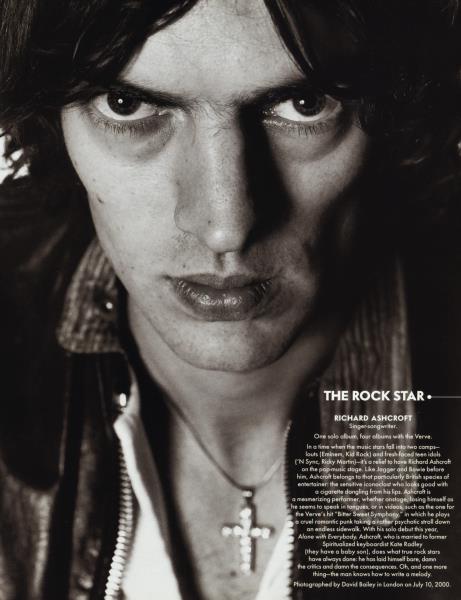 In a time when the music stars fall into two camps—louts (Eminem, Kid Rock) and fresh-faced teen idols ('N Sync, Ricky Martin)—it's a relief to have Richard Ashcroft on the pop-music stage. Like Jagger and Bowie before him, Ashcroft belongs to that particularly British species of entertainer: the sensitive iconoclast who looks good with a cigarette dangling from his lips. Ashcroft is a mesmerizing performer, whether onstage, losing himself as he seems to speak in tongues, or in videos, such as the one for the Verve's hit "Bitter Sweet Symphony," in which he plays a cruel romantic punk taking a rather psychotic stroll down an endless sidewalk. With his solo debut this year, Alone with Everybody, Ashcroft, who is married to former Spiritualized keyboardist Kate Radley (they have a baby son), does what true rock stars have always done: he has laid himself bare, damn the critics and damn the consequences. Oh, and one more thing—the man knows how to write a melody.