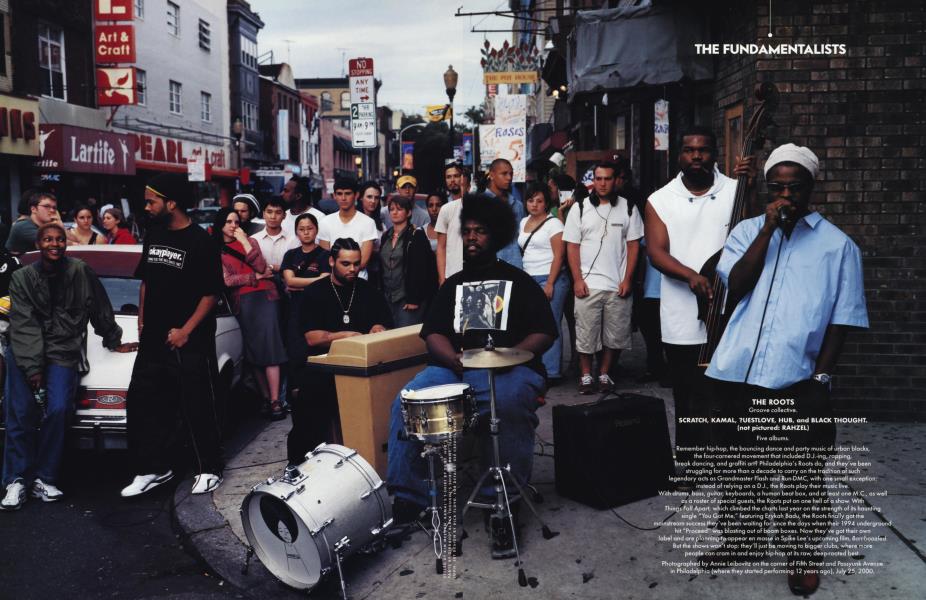 Remember hip-hop, the bouncing dance and party music of urban blacks, the four-cornered movement that included DJ.-ing, rapping, break dancing, and graffiti art? Philadelphia's Roots do, and they've been struggling for more than a decade to carry on the tradition of such legendary acts as Grandmaster Flash and Run-DMC, with one small exception: instead of relying on a D.J., the Roots play their music live.