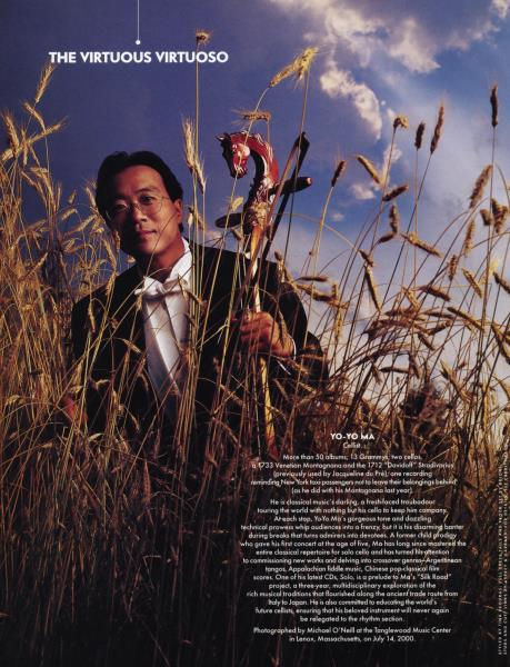 He is is classical classical music's music's darling, darling, a a fresh-faced fresh-faced troubadour troubadour touring the world with nothing but his cello to keep him company. At each stop, Yo-Yo Ma's gorgeous tone and dazzling / technical prowess whip audiences into a frenzy, but it is his disarming banter during breaks that turns admirers into devotees. A former child prodigy who gave his first concert at the age of five, Mo has long since mastered the entire classical repertoire for solo cello and has turned his attention to commissioning new works and delving into crossover genres—Argentinean tangos, Appalachian fiddle music, Chinese pop-classical film scores. One of his latest CDs, Solo, is a prelude to Ma's "Silk Road" project, a three-year, multidisciplinary exploration of the rich musical traditions that flourished along the ancient trade route from Italy to Japan. He is also committed to educating the world's future cellists, ensuring that his beloved instrument will never again be relegated to the rhythm section.