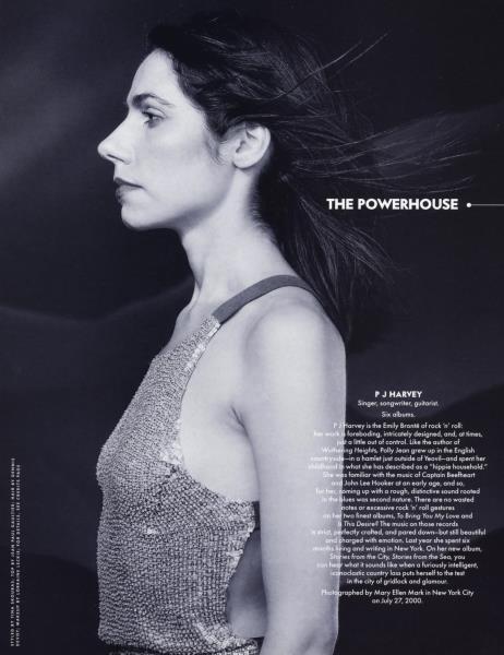P J Harvey is the Emily Bronte of rock 'n' roll: her work is foreboding, intricately designed, and, at times, just a little out of control. Like the author of Wuthering Heights, Polly Jean grew up in the English countryside—in a hamlet just outside of Yeovil—and spent her childhood in what she has described as a "hippie household.' She was familiar with the music of Captain Beefheart and John Lee Hooker at an early age, and so, for her, coming up with a rough, distinctive sound rooted in the blues was second nature. There are no wasted notes or excessive rock 'n' roll gestures on her two finest albums, To Bring You My Love and Is This Desire? The music on those records is strict, perfectly crafted, and pared down—but still beautiful and charged with emotion. Last year she spent six months living and writing in New York. On her new album, Stones from the City, Stories from the Sea, you can hear what it sounds like when a furiously intelligent, iconoclastic country lass puts herself to the test I in the city of gridlock and glamour.