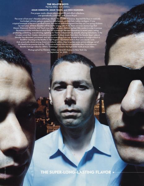 The cover of last year's Beasties anthology album, The Sounds of Science, depicted the Boys in comically low-budget old-man getups—pasted-on white beards, porkpie hats, nubby cardigans. It was a typical example of the trio's goofball humor, but also an acknowledgment that they ain't no spring chickens: by next year, all three Beasties will be on the wrong side of 35. There are even murmurings that Messrs. Diamond, Horovitz, and Yauch may hang it up soon, detonating their little combo in order to pursue the extracurricular activities to which they've increasingly devoted themselves in recent years: acting, producing, publishing, executivizing, agitating for Tibetan independence, actually playing instruments. In the 14 years since their cheeky, obnoxious Licensed to Ill album made them stars, the Beastie Boys' cultural blender has absorbed, processed, and spit out everything from rap to metal to jazz to lounge-schlock to Buddhist chanting to the Beatles to Ted Nugent's libertarian rants to their own Jewish roots.