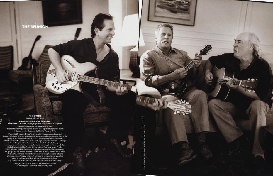 It's inevitably referred to as "jingle-jangle": the compressed sound of Roger McGuinn's 12-string Rickenbacker guitar, which lit up the Sunset Strip in the spring of 1965 and sent the L.A. band's first single—an electrified cover of Bob Dylan's "Mr. Tambourine Man" with high, jet-stream harmonies—straight to No. 1. No group has done as much for the treble knob. Few groups have been as influential: they were playing country-inspired licks years before Linda Ronstadt and the Eagles. Of the original five, only David Crosby, Chris Hillman, and McGuinn—the lone constant through all incarnations of the group—are still with us. Michael Clarke died in 1993, Gene Clark in 1991. Of late, McGuinn and Hillman have been recording traditional folk and bluegrass music. Crosby, when not getting a liver transplant or donating sperm to Melissa Etheridge, still performs in varying clusters with post-Byrds mates Stephen Stills, Graham Nash, and Neil Young.
