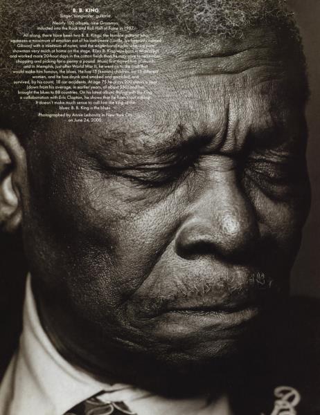 All along, there have been two B. B. Kings: te humble guitarist who squeezes a maximum of emotion out of his instrument (Lucille, his famously named Gibson) with a minimum of notes, and the singer-bandleader who is a pure showman very much at home on the stage. Riley B. King was born in Mississippi and worked more 20-hour days in the cotton fields than many care to remember, chopping and picking for a penny a pound. Music first moved him in church and in Memphis, just after World War II, he went on to the craft that would make him famous, the blues. He has 15 (known) children, by 15 different women, and he has drunk and smoked and gambled, and survived, by his count, 18 car accidents. At age 75 he plays 200 shows a year (down from his average, in earlier years, of about 350) and has brought the blues to 88 countries. On his latest album, Riding with the King, a collaboration with Eric Clapton, he shows that he hasn't lost a thing. It doesn't make much sense to call him the king of the blues: B. B. King is the blues.
