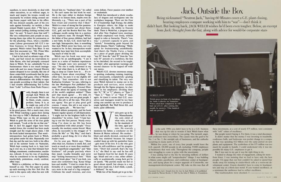 So, I understand you’re going to give my book a shitty review?” Jack Welch, to whom I had never previously spoken, had just walked into the conference room off his office at General Electric headquarters in Fairfield, Connecticut. A slight man who speaks with a heavy Boston accent— Wee ah not smahtah than everyone else; we just wuhrk haahdah—he seemed very ordinary, at least here. The elements of his incontrovertible genius—his abilities to spot deals, to crunch numbers, to move decisively, to deal with other executives, to ax without angst, to teach and inspire his troops—would not necessarily be evident sitting around eating frozen yogurt with him in his office. He was dressed casually, part of his crusade against formality: no necktie, a blue striped Ralph Lauren shirt. (“We have a joint venture [selling clothing on-line] with him,” he said. “It hasn’t done that well.”) His very ordinariness puts people at ease, leaving them ripe either for persuasion or for the plucking. Once, when a meddlesome Labour government left G.E.’s turbine business in Great Britain nearly aground, Welch visited Tony Blair. It was their first encounter too. “Mr. Prime Minister, I’m in deep shit,” Welch began.