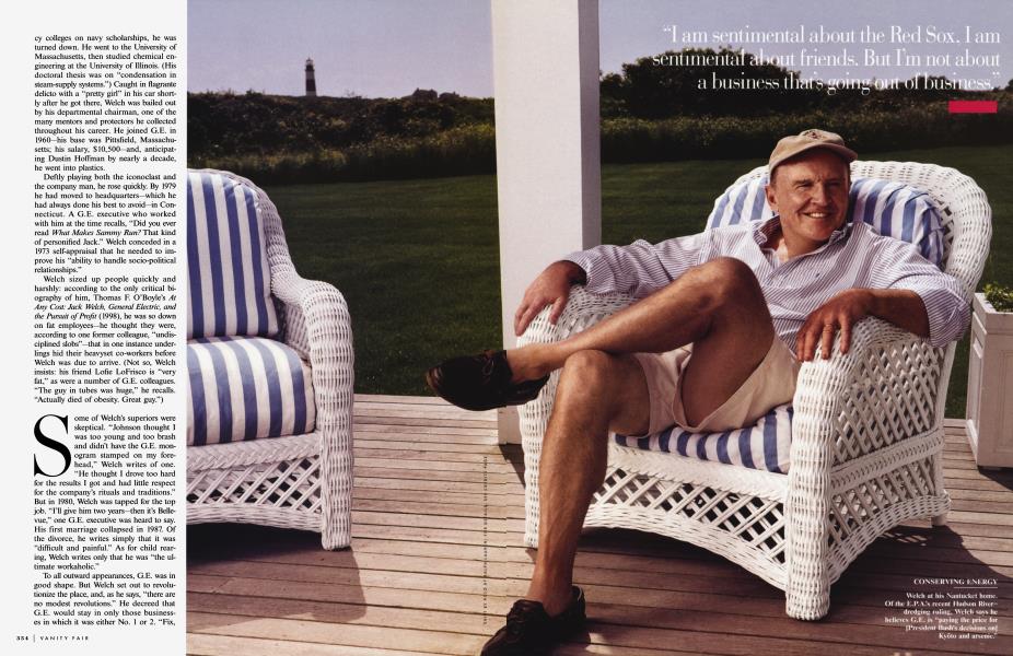 October 2001 David Margolick Annie LeibovitzAfter becoming C.E.O. of General Electric in 1981, Jack Welch was ranked as one of America’s toughest bosses for the layoffs and “Fix, Sell, or Close" strategy by which he revolutionized the company. Two decades later, he had made G.E. the most valuable corporation on the planet—and himself the most admired C.E.O. of his era. Now, with Welch’s retirement and memoir arriving, DAVID MARGOLICK finds him on Nantucket, to talk about how he wrestled with the recent Honeywell-merger and Hudson River-PCB controversies, why he’ll never again drink inexpensive wine, and what he left out of his book