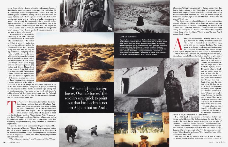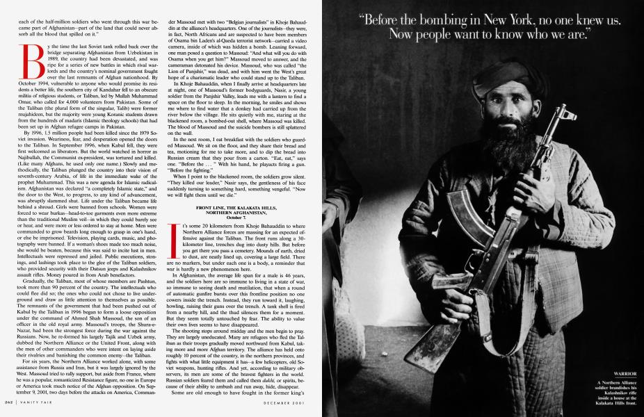 The shooting stops around midday and the men begin to pray. They are largely uneducated. Many are refugees who fled the Taliban as their troops gradually moved northward from Kabul, taking more and more Afghan territory. The alliance has held onto roughly 10 percent of the country, in the northern provinces, and fights with what little equipment it has—a few helicopters, old Soviet weapons, hunting rifles. And yet, according to military observers, its men are some of the bravest fighters in the world. Russian soldiers feared them and called them dukhi, or spirits, because of their ability to ambush and run away, hide, disappear.