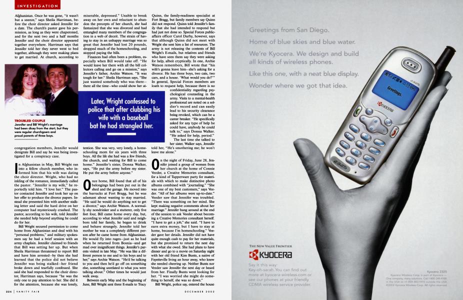 December 2002 Maureen OrthLast January, Jennifer Wright began telling close friends that she was getting letters from an anonymous stalker and threatening phone calls. She said they warned her to stay away from the choir director at her church, a divorced man who made it no secret that he found Jennifer attractive. Jennifer, 32, was married to Master Sergeant William Wright, 36, a career army man for 18 years, assigned to the Special Forces and seemingly away on duty more than he was home. After 12 years of marriage, Jennifer had begged Bill to leave his job or at least find a way to be home more, but he refused, and their relationship had been shaky for some time. In 1991, Jennifer had left Bill for a short period, only to return and ask forgiveness. Two years ago she became attracted to another man and, according to a friend, confessed it to her husband when he returned from Bosnia. She told friends that he had stayed angry with her ever since. In February of this year he left for training in Georgia, and in March he was sent to Afghanistan.