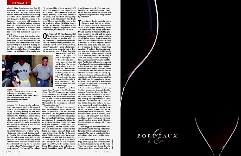 The string of deaths created a media firestorm which has not yet abated. Once again the curse of Fort Bragg had struck. It had begun sensationally in the 70s, when Green Beret captain Jeffrey MacDonald, an army doctor, reported the gruesome murder of his wife and two young daughters, murders he got away with for a decade before he was finally convicted in 1982, after his 1979 conviction had been overturned. In the 80s, Sergeant Timothy Hennis was found guilty—and later acquitted—of slashing the throats of an air-force captain's wife and two daughters; the murders have never been solved. In 1995 another army sergeant, William Kreutzer, opened fire on a field of paratroopers beginning a dawn run, killing one and wounding 18. That same year, James Burmeister and Malcolm Wright, two soldiers who were part of a culture of white-supremacist skinheads at Fort Bragg, shot and killed two black Fayetteville townspeople. The town, where fundamentalist Bible Belt churches vie with biker bars and honky-tonks, has a rough reputation. Last January, Damian Franceschi was charged with slashing the throat of his wife, Shalamar, five days after he left the army and three days after he was released from jail for raping her and holding her mother and child hostage.