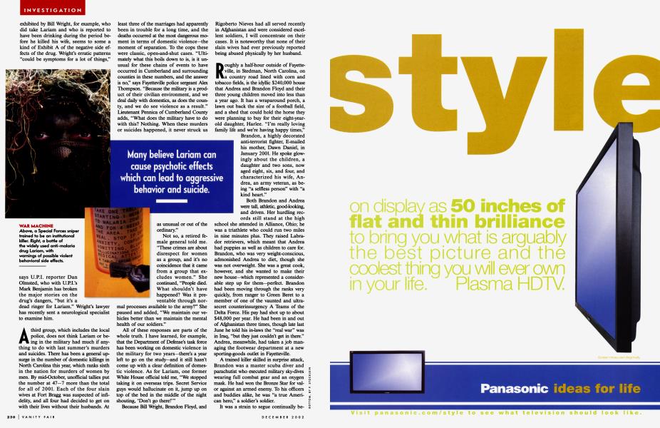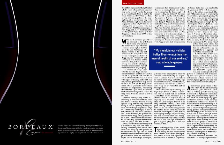 December 2002 Maureen OrthAfter a string of slayings and suicides at the base, the army is grappling with its domestic-violence problem. In three cases, model soldiers who'd served in Afghanistan killed their wives. Were they simply unable to leave the war behind, or did an anti-malaria drug turn them psychotic?