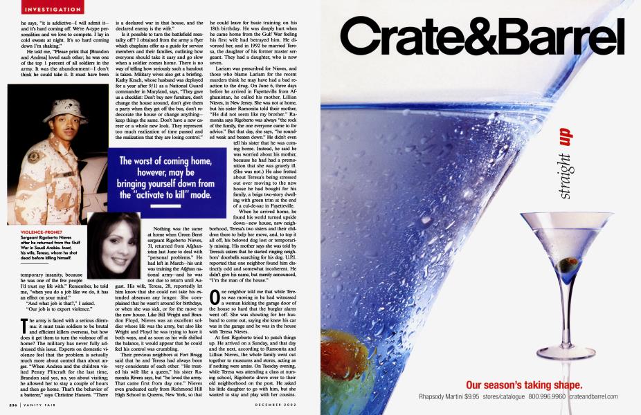 Is it possible to turn the battlefield mentality off? I obtained from the army a flyer which chaplains offer as a guide for service members and their families, outlining how everyone should take it easy and go slow when a soldier comes home. There is no way of telling how seriously such a handout is taken. Military wives also get a briefing. Kathy Krach, whose husband was deployed for a year after 9/11 as a National Guard commander in Maryland, says, "They gave us a checklist: Don't buy new furniture, don't change the house around, don't give them a party when they get off the bus, don't redecorate the house or change anything—keep things the same. Don't have a new career or a whole new look. They represent too much realization of time passed and the realization that they are losing control." Nothing was the same at home when Green Beret sergeant Rigoberto Nieves, 31, returned from Afghanistan last June to deal with "personal problems." He had left in March—his unit was training the Afghan national army—and he was not due to return until August. His wife, Teresa, 28, reportedly let him know that she could not take his extended absences any longer. She complained that he wasn't around for birthdays, or when she was sick, or for the move to the new house. Like Bill Wright and Brandon Floyd, Nieves was an excellent soldier whose life was the army, but also like Wright and Floyd he was trying to have it both ways, and as soon as his wife shifted the balance, it would appear that he could feel his control was crumbling.