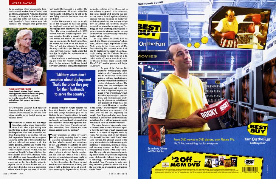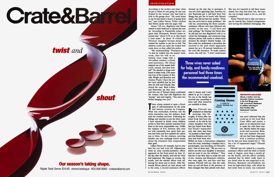 The army, however, has already begun to demand more accountability with regard to how the survivors of such tragedies are treated. As a result of inquiries made by Vanity Fair to army chief of staff General Eric Shinseki, I received a call from Colonel Gina Farrisee, the adjutant general of the army, whose duties include overseeing the handling of casualties, missing persons, and mortuary services, to thank me for bringing these matters to the army's attention. The army, she said, is currently rewriting instructions for personnel regarding cases of domestic violence such as those at Fort Bragg. "We owe them a lot more," she added, "and I'm going to make sure they have clear guidance and can call us at the top while we are rewriting instructions for the future."