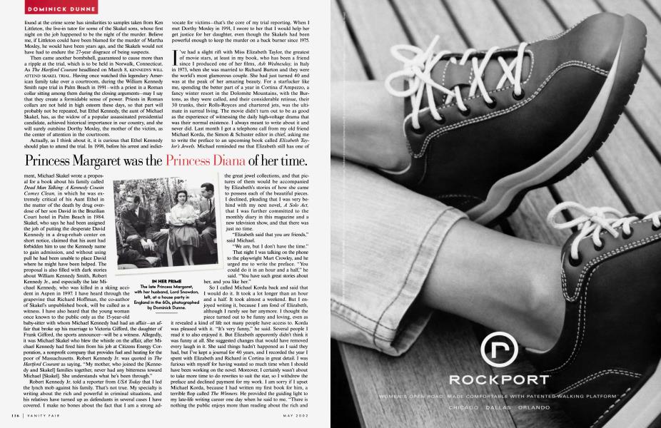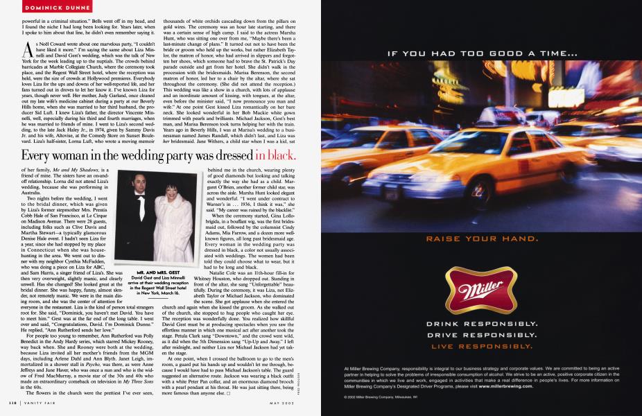 May 2002 Dominick Dunne Michael O'NeillAfter firing a final, well-deserved shot into the corpse of Gary Condit’s political career, the author turns to the latest gossip from the Michael Skakel murder trial, a little dustup with the great Elizabeth Taylor, and—what diarist would miss it?—the scene at Liza’s wedding
