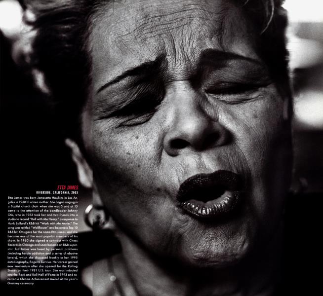 Etta James was born Jamesetta Hawkins in Los Angeles in 1938 to a teen mother. She began singing in a Baptist church choir when she was 5 and at 15 came to the attention of the bandleader Johnny Otis, who in 1953 took her and two friends into a studio to record "Roll with Me Henry," a response to Hank Ballard's R&B hit "Work with Me Annie." The song was retitled "Wallflower" and became a Top 10 R&B hit. Otis gave her the name Etta James, and she became one of the most popular members of his show. In 1960 she signed a contract with Chess Records in Chicago and soon became an R&B superstar. But James was beset by personal problems (including heroin addiction and a series of abusive lovers), which she discussed frankly in her 1995 autobiography, Rage to Survive. Her career gained new momentum after she opened for the Rolling Stones on their 1981 U.S. tour. She was inducted into the Rock and Roll Hall of Fame in 1993 and received a Lifetime Achievement Award at this year's Grammy ceremony.