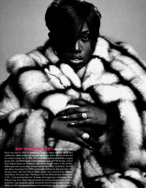 Elliott was born in 1971, in Portsmouth, Virginia, where she was raised in a middle-class, albeit violent and abusive, household. When she was 13 she and her mother moved out. In 1991, Missy and three girlfriends formed a singing group, Sista, and Elliott began collaborating on songs with Tim Mosely, a friend from Virginia known as Timbaland, with whom she still works. In the mid-90s, Elektra gave her a recording contract and her own label, Gold Mine. Her first solo album, Supa Dupa Fly (1997), produced by Timbaland, debuted at No. 3 on the pop chart, sold more than a million copies, and received three Grammy nominations. Two years later, "Hot Boyz," from her album Da Real World, went to No. 1 and remained there for 18 weeks, the longest stay in the history of the Billboard rap chart. Elliott, who is a producer and businesswoman as well as a performer, sings about sex, money, and power from the female point of view. In 2002 and 2003 she received Grammys for best female rap solo performance.