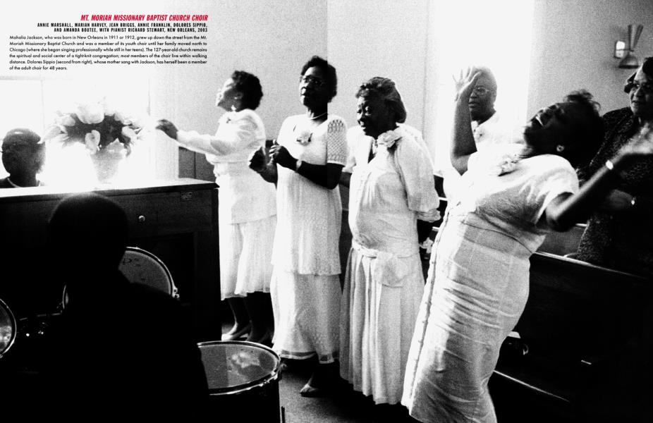 Mahalia Jackson, who was born in New Orleans in 1911 or 1912, grew up down the street from the Mt. Moriah Missionary Baptist Church and was a member of its youth choir until her family moved north to Chicago (where she began singing professionally while still in her teens). The 127-year-old church remains the spiritual and social center of a tight-knit congregation; most members of the choir live within walking distance. Dolores Sippio (second from right), whose mother sang with Jackson, has herself been a member of the adult choir for 48 years.
