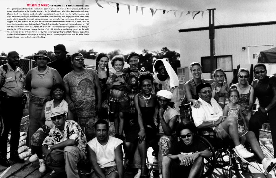 Three generations of the Neville family have been involved with music in New Orleans, but the best-known manifestation is the Neville Brothers: Art (in wheelchair), who plays keyboards and sings; Charles (back row, tie-dyed shirt), who plays saxophone; Aaron (back row, far right), who sings and plays percussion; and Cyril (middle row, white hat), who also sings and plays percussion. Their funky music, with its exquisite four-part harmonies, draws on several styles: rhythm and blues, jazz, soul, reggae, rock, and zydeco. Art, 65, was the first family member to become prominent, in 1954, when his band, the Hawkettes, recorded the classic "Mardi Gras Mambo.* Aaron, 62, became famous in 1966 with the ballad "Tell It Like It Is." Charles, 64, played the saxophone in several jazz bands. All three got together in 1976, with their younger brother, Cyril, 55, initially as the backup group for the Wild Tchoupitoulas, a New Orleans "tribe" led by their uncle George "Big Chief Jolly" Landry. Each of the brothers has had several solo projects, including Aaron's recent gospel albums, and the wider family has contributed vocal and instrumental backing.