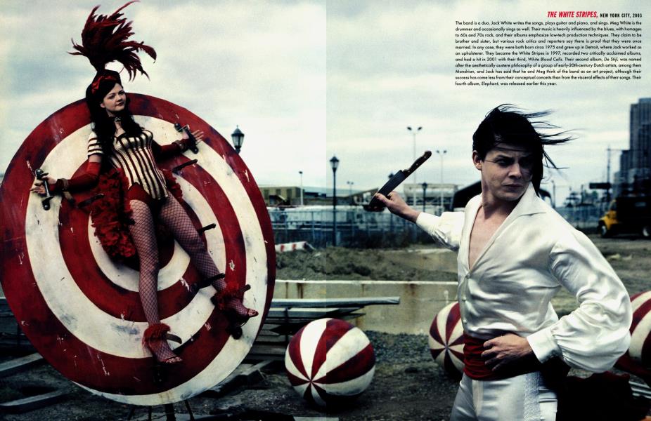 The band is a duo. Jack White writes the songs, plays guitar and piano, and sings. Meg White is the drummer and occasionally sings as well. Their music is heavily influenced by the blues, with homages to 60s and 70s rock, and their albums emphasize low-tech production techniques. They claim to be brother and sister, but various rock critics and reporters say there is proof that they were once married. In any case, they were both born circa 1975 and grew up in Detroit, where Jack worked as an upholsterer. They became the White Stripes in 1997, recorded two critically acclaimed albums, and had a hit in 2001 with their third, White Blood Cells. Their second album, De Stijl, was named after the aesthetically austere philosophy of a group of early-20th-century Dutch artists, among them Mondrian, and Jack has said that he and Meg think of the band as an art project, although their success has come less from their conceptual conceits than from the visceral effects of their songs. Their fourth album, Elephant, was released earlier this year.