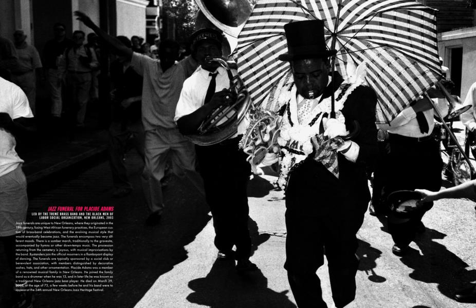 Jazz funerals are unique to New Orleans, where they originated in the 19th century, fusing West African funerary practices, the European custom of brass-band celebrations, and the evolving musical style that would eventually become jazz. The funerals encompass two very different moods. There is a somber march, traditionally to the gravesite, accompanied by hymns or other down-tempo music. The procession returning from the cemetery is joyous, with musical improvisations by the band. Bystanders join the official mourners in a flamboyant display of dancing. The funerals are typically sponsored by a social club or benevolent association, with members distinguished by decorative sashes, hats, and other ornamentation. Placide Adams was a member of a renowned musical family in New Orleans. He joined the family band as a drummer when he was 13, and in later life he was known as a traditional New Orleans jazz bass player. He died on March 29, 2005T at the age of 73, a few weeks before he and his band were to appear at the 34th annual New Orleans Jazz Heritage Festival.
