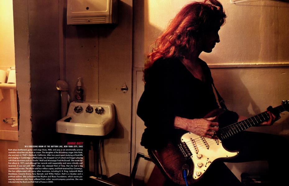 Raitt plays bottleneck guitar and sings blues, R&B, and pop in an emotionally precise contralto voice that can shout or croon. The daughter of the Broadway singer John Raitt, she was born in 1949 in Burbank, California. After two years spent studying at Radcliffe and singing in Cambridge coffeehouses, she dropped out of school and began playing with blues musicians such as Howlin' Wolf and Mississippi Fred McDowell. She made her first album in 1971, and although her records sold respectably and were critically well received, it was not until 1989, when she released Nick of Time, that she had a big commercial success. The album sold four million copies, and Raitt received four Grammys. She has collaborated with many other musicians, including B. B. King, Ladysmith Black Mambazo, Cesaria Evora, Tony Bennett, and Willie Nelson. Raitt is a Quaker and a political activist. She co-founded the Rhythm and Blues Foundation, which assists pioneering musicians who have suffered from unfair record-company practices. She was inducted into the Rock and Roll Hall of Fame in 2000.