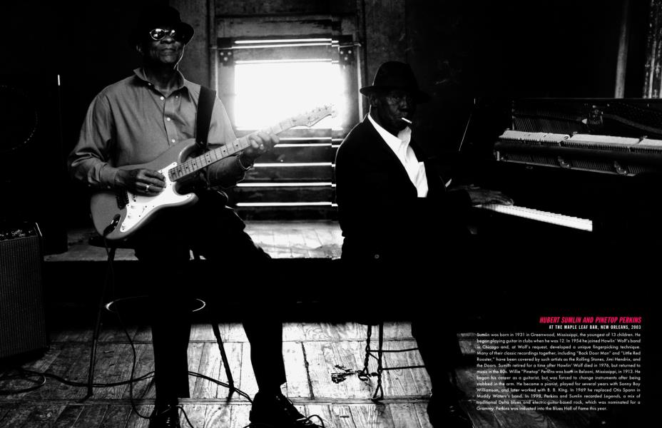Sumlin was born in 1931 in Greenwood, Mississippi, the youngest of 13 children. He began playing guitar in clubs when he was 12. In 1954 he joined Howlin' Wolf's band in Chicago and, at Wolf's request, developed a unique fingerpicking technique. Many of their classic recordings together, including "Back Door Man" and "Little Red Rooster," have been covered by such artists as the Rolling Stones, Jimi Hendrix, and the Doors. Sumlfn retired for a time after Howlin' Wolf died in 1976, but returned to music in the 80s. Willie "Pinetop" Perkins was bolt) in Belzoni, Mississippi, in 1913. He began his career as a guitarist, but was forced to change instruments after being stabbed in the arm. He became a pianist, played for several years with Sonny Boy Williamson, and later worked with B. B. King. In 1969 he replaced Otis Spann in Muddy Waters's band. In 1998, Perkins and Sumlin recorded Legends, a mix of traditional Delta blues and electric-guitar-based rock, which was nominated for a Grammy. Perkins was inducted into the Blues Hall of Fame this year.