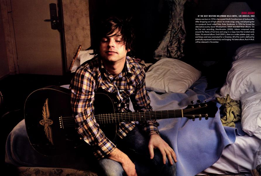 Adams was born in 1974 in the coastal North Carolina town of Jacksonville. After dropping out of high school, he wrote songs, sang, and played guitar in a post-punk band called Patty Duke Syndrome. In 1994 he formed the alternative-country band Whiskeytown, which recorded three albums. On his first solo recording, Heartbreaker (2000), Adams composed songs around the theme of lost love and sang in a raspy tone that evoked early Dylan. His second album, Gold (2001), drew on a wider palette—pop, rock, and blues—and was nominated for a Grammy. All of his work is defined by poetically expressed melancholy and longing. His latest album, Rock N Roll, will be released in November.