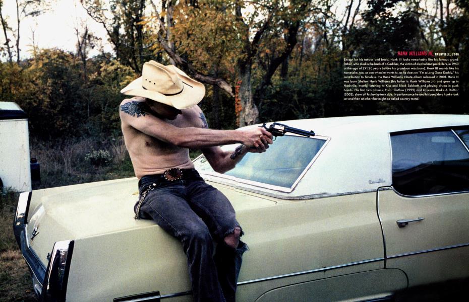 Except for his tattoos and braid, Hank III looks remarkably like his famous grandfather, who died in the back of a Cadillac, the victim of alcohol and painkillers, in 1953 at the age of 29 (20 years before his grandson was born). Hank III sounds like his namesake, too, or can when he wants to, as he does on "I'm a Long Gone Daddy," his contribution to Timeless, the Hank Williams tribute album released in 2001. Hank III was born Shelton Hank Williams (his father is Hank Williams Jr.) and grew up in Nashville, mostly, listening to Kiss and Black Sabbath and playing drums in punk bands. His first two albums, Risin' Outlaw (1999) and Lovesick Broke & Driftin' (2002), show off his honky-tonk side. In performance he and his band do a honky-tonk set and then another that might be called country-metal.
