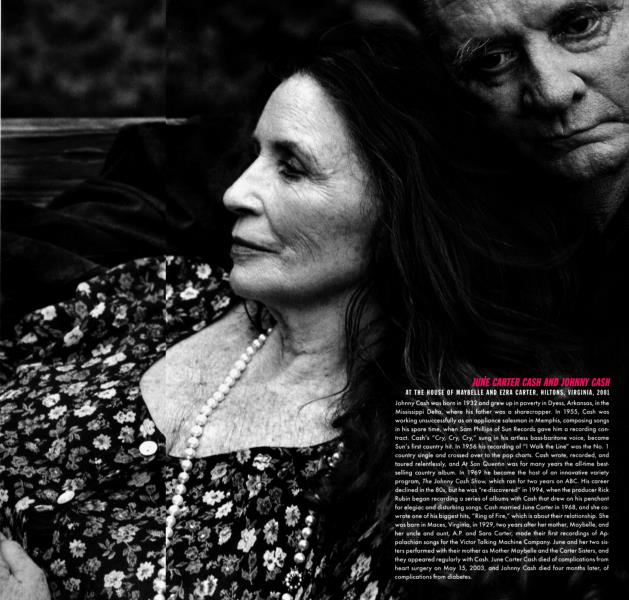 Johnny Cash was born in 1932 and grew up in poverty in Dyess, Arkansas, in the Mississippi Delta, where his father was a sharecropper. In 1955, Cash was working unsuccessfully as an appliance salesman in Memphis, composing songs in his spare time, when Sam Phillips of Sun Records gave him a recording contract. Cash's "Cry, Cry, Cry," sung in his artless bass-baritone voice, became Sun's first country hit. In 1956 his recording of "I Walk the Line" was the No. 1 country single and crossed over to the pop charts. Cash wrote, recorded, and toured relentlessly, and At San Quentin was for many years the all-time bestselling country album. In 1969 he became the host of an innovative variety program, The Johnny Cash Show, which ran for two years on ABC. His career declined in the 80s, but he was "re discovered" in 1994, when the producer Rick Rubin began recording a series of albums with Cash that drew on his penchant for elegiac and disturbing songs. Cash married June Carter in 1968, and she cowrote one of his biggest hits, "Ring of Fire," which is about their relationship. She was born in Maces, Virginia, in 1929, two years after her mother, Maybelle, and her uncle and aunt, A.P. and Sara Carter, made their first recordings of Appalachian songs for the Victor Talking Machine Company. June and her two sisters performed with their mother as Mother Maybelle and the Carter Sisters, and they appeared regularly with Cash. June Carter Cash died of complications from heart surgery on May 15, 2003, and Johnny Cash died four months later, of complications from diabetes.