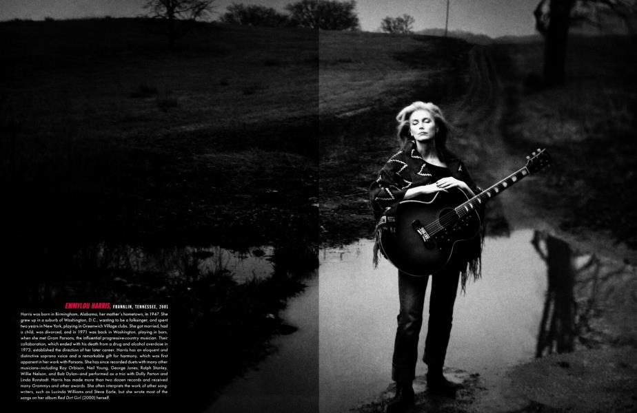 Harris was born in Birmingham, Alabama, her mother's hometown, in 1947. She grew up in a suburb of Washington, D.C., wanting to be a folksinger, and spent two years in New York, playing in Greenwich Village clubs. She got married, had a child, was divorced, and in 1971 was back in Washington, playing in bars, when she met Gram Parsons, the influential progressive-country musician. Their collaboration, which ended with his death from a drug and alcohol overdose in 1973, established the direction of her later career. Harris has an eloquent and distinctive soprano voice and a remarkable gift for harmony, which was first apparent in her work with Parsons. She has since recorded duets with many other musicians—including Roy Orbison, Neil Young, George Jones, Ralph Stanley, Willie Nelson, and Bob Dylan—and performed as a trio with Dolly Parton and Linda Ronstadt. Harris has made more than two dozen records and received many Grammys and other awards. She often interprets the work of other songwriters, such as Lucinda Williams and Steve Earle, but she wrote most of the songs on her album Red Dirt Girl (2000) herself.