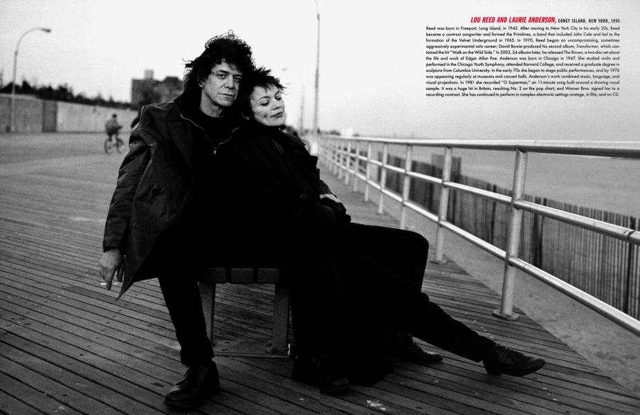 Reed was born in Freeport, Long Island, in 1942. After moving to New York City in his early 20s, Reed became a contract songwriter and formed the Primitives, a band that included John Cole and led to the formation of the Velvet Underground in 1965. In 1970, Reed began an uncompromising, sometimes aggressively experimental solo career; David Bowie produced his second album, Transformer, which contained the hit "Walk on the Wild Side." In 2003,24 albums later, he released The Raven, a two-disc set about the life and work of Edgar Allan Poe. Anderson was born in Chicago in 1947. She studied violin and performed in the Chicago Youth Symphony, attended Barnard College, and received a graduate degree in sculpture from Columbia University. In the early 70s she began to stage public performances, and by 1976 was appearing regularly at museums and concert halls. Anderson's work combined music, language, and visual projections. In 1981 she recorded "O Superman," an 11-minute song built around a droning vocal sample. It was a huge hit in Britain, reaching No. 2 on the pop chart, and Warner Bros, signed her to a recording contract. She has continued to perform in complex electronic settings onstage, in film, and on CD.
