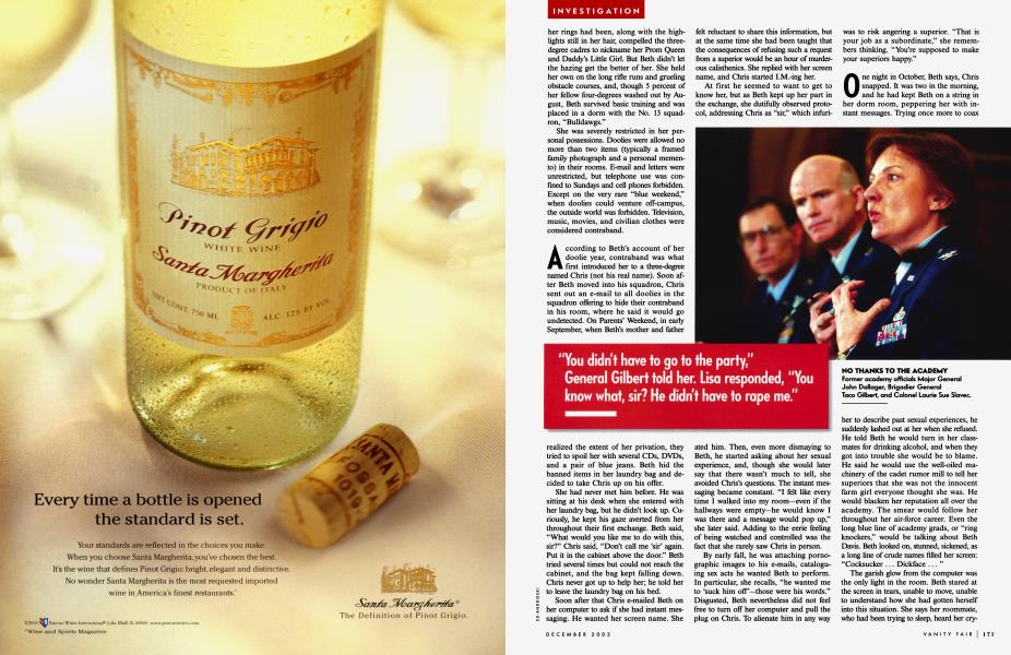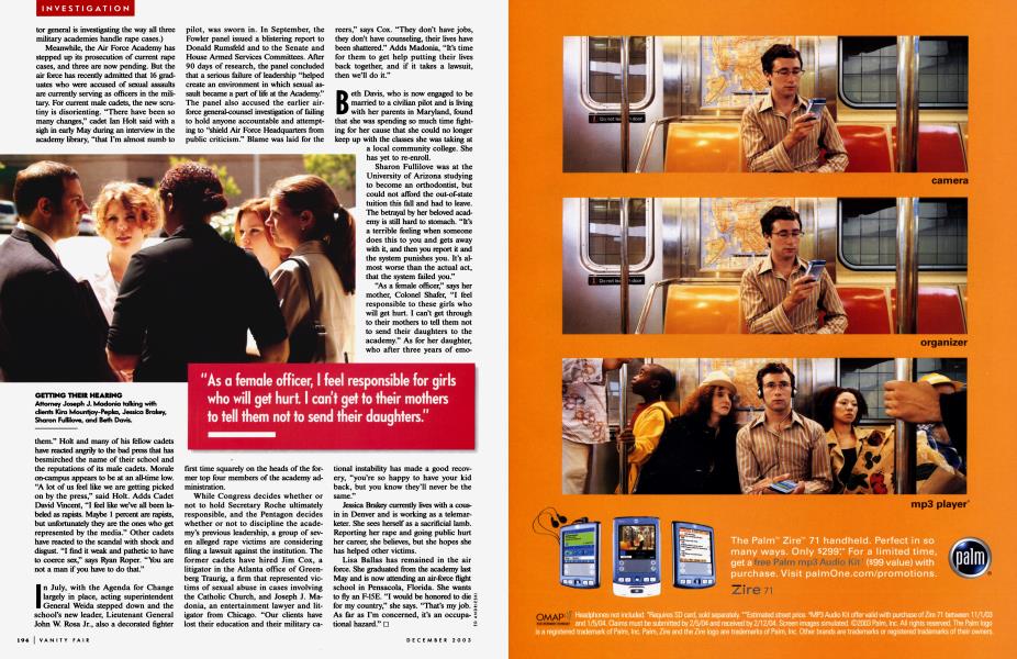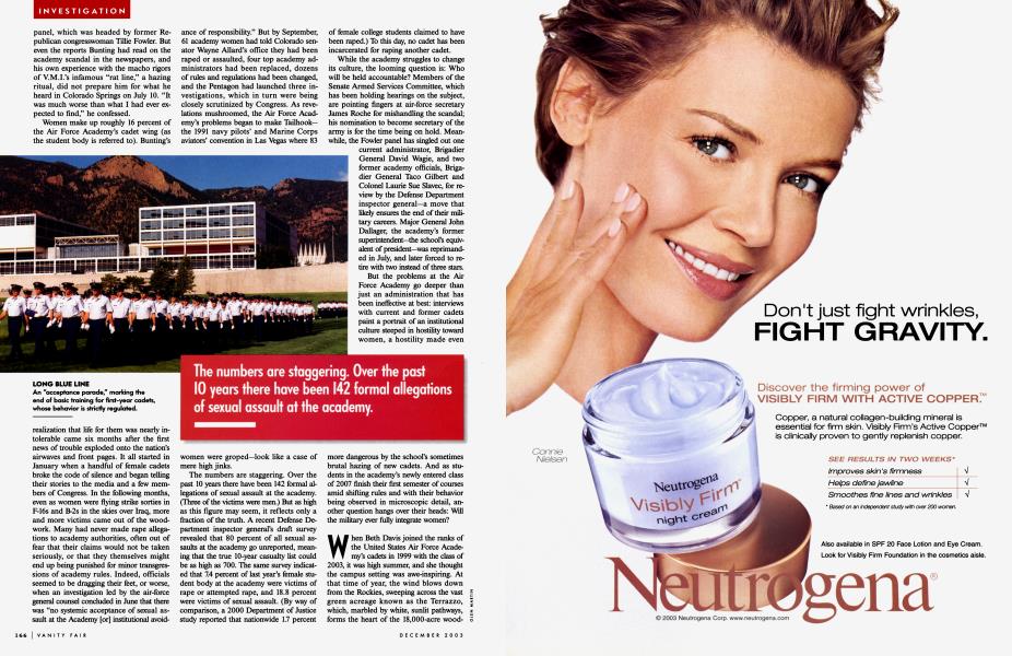 December 2003 Clara Bingham Harry BensonFour young women dressed in civilian clothes entered an office conference room in Colorado Springs on July 10, 2003. They sat down and one by one told their stories of how, while attending the nearby United States Air Force Academy, they had been raped by fellow cadets and subsequently punished by the academy's administrators. The women were not addressing a judge or a jury. They spoke instead to seven people: a former congresswoman, two retired generals, a retired colonel, a military sociologist, a rape-victim advocate, and a psychiatrist, all of whom had been handpicked by Secretary of Defense Donald Rumsfeld to investigate the burgeoning scandal at the academy.