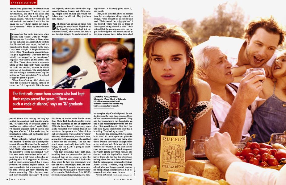 At an official event in Colorado Springs, just the sight of Senator Allard's name printed on the tag on Broerman's chest sparked a startling conversation. "A man introduced himself to me and told me that he was an academy grad, and his daughter also went there and was raped," Broerman recalls. "His daughter is an air-force pilot now, and her father confessed to me that he had advised her not to report the rape, because he knew how much she wanted to fly. Tears were falling down his face as he told me, 'I've lived with this burden for too many years.'" By September 2003, Allard's office had been contacted by 38 former cadets, 23 current cadets, and one civilian, all of whom said they had been raped by Air Force Academy men.