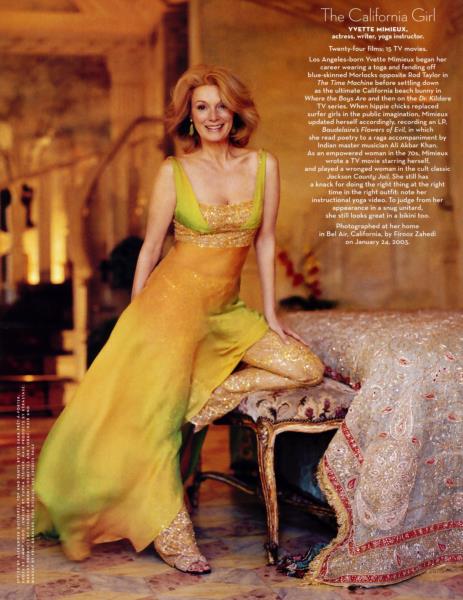 Los Angeles-born Yvette Mimieux began her career wearing a toga and fending off blue-skinned Morlocks opposite Rod Taylor in The Time Machine before settling down as the ultimate California beach bunny in Where the Boys Are and then on the Dr. Kildare TV series. When hippie chicks replaced surfer girls in the public imagination, Mimieux updated herself accordingly, recording an LP. Baudelaire's Flowers of Evil, in which she read poetry to a raga accompaniment by Indian master musician Ali Akbar Khan. As an empowered woman in the 70s, Mimieux wrote a TV movie starring herself, and played a wronged woman in the cult classic Jackson County Jail. She still has a knack for doing the right thing at the right time in the right outfit: note her instructional yoga video. To judge from her appearance in a snug unitard, she still looks great in a bikini too.