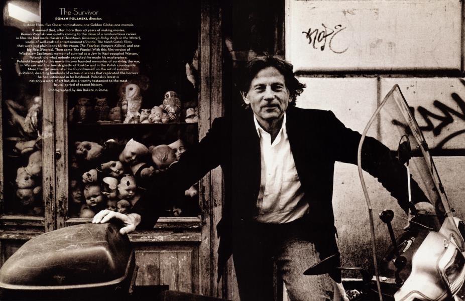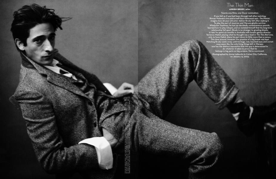 If you felt as if you had been through hell after watching Roman Polanski's two-and-a-half-hour Holocaust epic, The Pianist, imagine how 29-year-old actor Adrien Brody felt after making it. To play the part of musician and Warsaw-ghetto survivor Wladyslaw Szpilman, he lost 30 decidedly nonextraneous pounds, learned how to play Chopin, and so isolated himself that his long-term relationship fell apart. Brody is no stranger to grueling shoots: in 1997 he spent six months in Australia with lunatic-genius director Terrence Malick playing what he thought was a lead inThe Thin Red Line, only to have Malick shave his part down to little more than a cameo. This time around, however, the promise of a big break was kept. Watching Brody waste away, until his huge, wet, haunted eyes and cornet nose seem like the only living things left in Warsaw, one has the distinct impression that this guy is determined to do whatever it takes to prove that he belongs in big parts on big screens. We’re convinced.