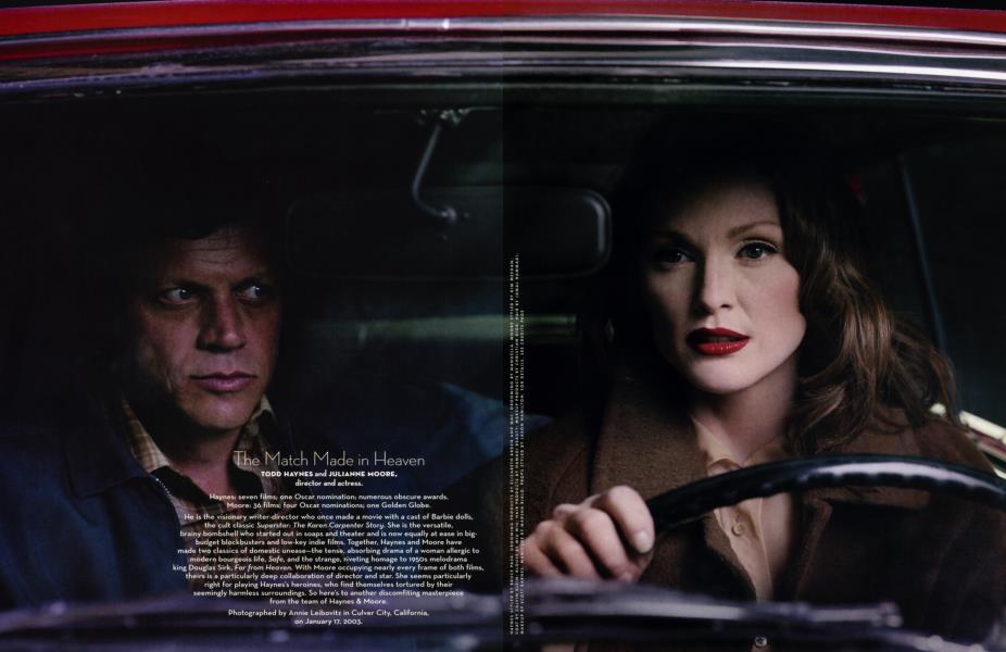 He is the visionary writer-director who once made a movie with a cast of Barbie dolls, the cult classic Superstar: The Karen Carpenter Story. She is the versatile, brainy bombshell who started out in soaps and theater and is now equally at ease in big-budget blockbusters and low-key indie films. Together, Haynes and Moore have made two classics of domestic unease—the tense, absorbing drama of a woman allergic to modern bourgeois life, Safe, and the strange, riveting homage to 1950s melodrama king Douglas Sirk, Far from Heaven. With Moore occupying nearly every frame of both films, theirs is a particularly deep collaboration of director and star. She seems particularly right for playing Haynes’s heroines, who find themselves tortured by their seemingly harmless surroundings. So here’s to another discomfiting masterpiece from the team of Haynes & Moore.