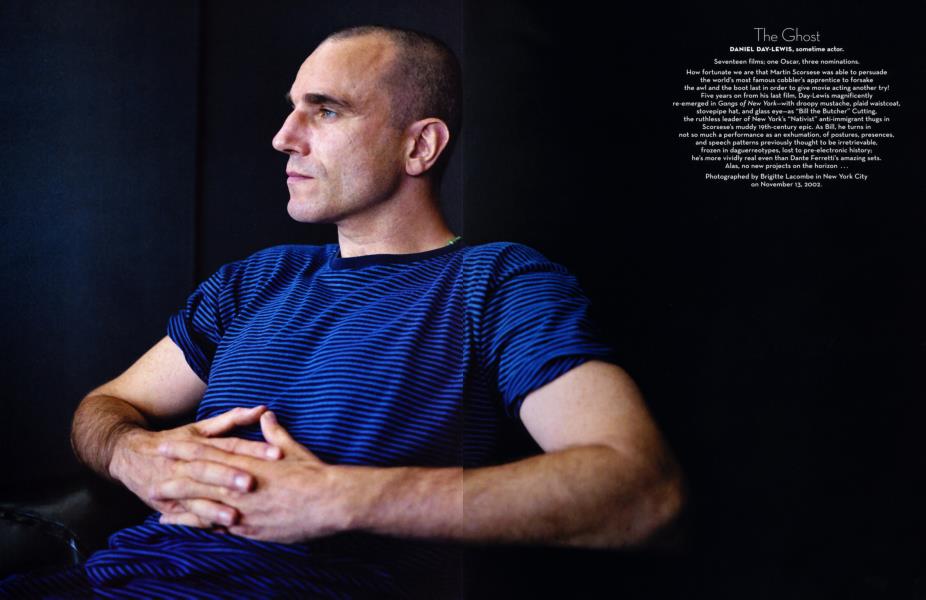 How fortunate we are that Martin Scorsese was able to persuade the world’s most famous cobbler’s apprentice to forsake the awl and the boot last in order to give movie acting another try! Five years on from his last film, Day-Lewis magnificently re-emerged in Gangs of New York—with droopy mustache, plaid waistcoat, stovepipe hat, and glass eye—as “Bill the Butcher” Cutting, the ruthless leader of New York’s “Nativist" anti-immigrant thugs in Scorsese’s muddy 19th-century epic. As Bill, he turns in not so much a performance as an exhumation, of postures, presences, and speech patterns previously thought to be irretrievable, frozen in daguerreotypes, lost to pre-electronic history; he’s more vividly real even than Dante Ferretti’s amazing sets. Alas, no new projects on the horizon . . .