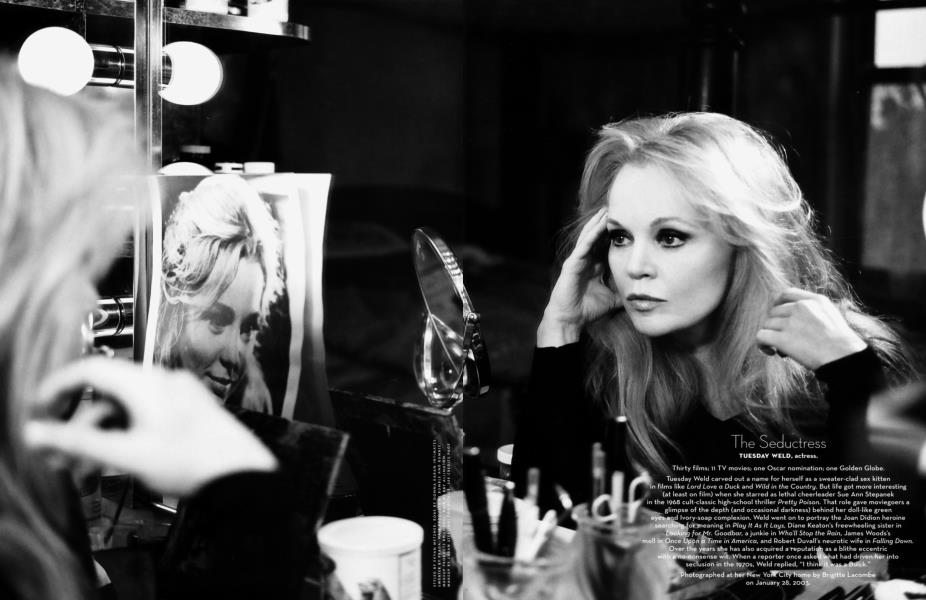 Tuesday Weld carved out a name for herself as a sweater-clad sex kitten in films like Lord Love a Duck and Wild in the Country. But life got more interesting (at least on film) when she starred as lethal cheerleader Sue Ann Stepanek in the 1968 cult-classic high-school thriller Pretty Poison. That role gave moviegoers a glimpse of the depth (and occasional darkness) behind her doll-like green -ad Ivory-soap complexion. Weld went on to portray the Joan Didion heroine searching for meaning in Play It As It Lays, Diane Keaton's freewheeling sister in Looking for Mr. Goodbar, a junkie in Who'll Stop the Pain, James Woods's moll in Once Upon a Time in America, and Robert Duvall's neurotic wife in Falling Down. Over the years she has also acquired a reputation as a blithe eccentric no-nonsense wit. When a reporter once asked what had driven her jnto seclusion in the 1970s, Weld replied, "I think it was a Buick."