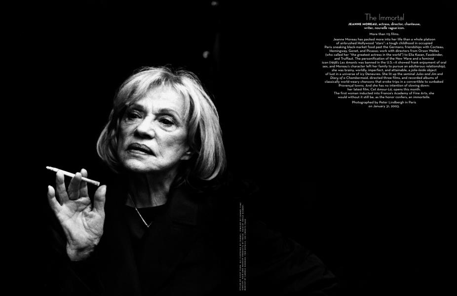 Jeanne Moreau has packed more into her life than a whole platoon of airbrushed Hollywood “stars”: a tough childhood in occupied Paris sneaking black-market food past the Germans; friendships with Cocteau, Hemingway, Genet, and Picasso; work with directors from Orson Welles (who called her “the greatest actress in the world”) to Elia Kazan, Fassbinder, and Truffaut. The personification of the New Wave and a feminist icon (1958’s Les Amants was banned in the U.S.—it showed frank enjoyment of oral sex, and Moreau’s character left her family to pursue an adulterous relationship), she was brainy, worldly, imperfect, and attainable, a jolie-laide object of lust in a universe of icy Deneuves. She lit up the seminal Jules and Jim and Diary of a Chambermaid, directed three films, and recorded albums of classically world-weary chansons that evoke trips in a convertible to sunbaked Provencal towns. And she has no intention of slowing down; her latest film, Cet Amour-Là, opens this month. The first woman inducted into France’s Academy of Fine Arts, she would without it still be, as the honor confers, an immortelle.