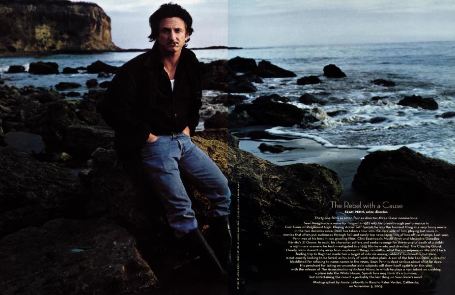 Sean Penn made a name for himself in 1982 with his breakthrough performance in Fast Times at Ridgemont High. Playing stoner Jeff Spicoli, he was the funniest thing in a very funny movie. In the two decades since, Penn has taken a tour into the dark side of film, playing lost souls in movies that often put audiences through hell and rarely top newspaper lists of box-office champs. Last year, Penn was at his best in two grueling films, Clint Eastwood's Mystic River and Alejandro Gonzalez Iñárritu's 21 Grams. In each, his character suffers and seeks revenge for the wrongful death of a child— a nightmare scenario he had investigated in a 1995 film he wrote and directed, The Crossing Guard. Clearly, Penn doesn’t shy away from unpleasant things, no matter what the consequences. His 2002 fact-finding trip to Baghdad made him a target of ridicule among cable-TV loudmouths, but Penn is not exactly looking to be loved, as his body of work makes plain. A son of the late Leo Penn, a director blacklisted for refusing to name names in the 1950s, Sean Penn is dead serious about what he does. His penchant for taking on uncomfortable subjects will show itself again later this year with the release of The Assassination of Richard Nixon, in which he plays a man intent on crashing a plane into the White House. Spicoli fans may think it’s a bummer, but entertaining the crowd is probably the last thing on Sean Penn’s mind.