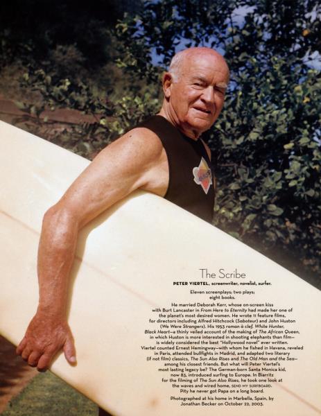 He married Deborah Kerr, whose on-screen kiss with Burt Lancaster in From Here to Eternity had made her one of the planet’s most desired women. He wrote 11 feature films, for directors including Alfred Hitchcock (Saboteur) and John Huston (We Were Strangers). His 1953 roman a clef, White Hunter, Black Heart—a thinly veiled account of the making of The African Queen, in which Huston is more interested in shooting elephants than film— is widely considered the best “Hollywood novel” ever written. Viertel counted Ernest Hemingway—with whom he fished in Havana, reveled in Paris, attended bullfights in Madrid, and adapted two literary (if not film) classics, The Sun Also Rises and The Old Man and the Sea— among his closest friends. But what will Peter Viertel’s most lasting legacy be? The German-born Santa Monica kid, now 83, introduced surfing to Europe. In Biarritz for the filming of The Sun Also Rises, he took one look at the waves and wired home, SEND MY SURFBOARD. Pity he never got Papa on a long board.
