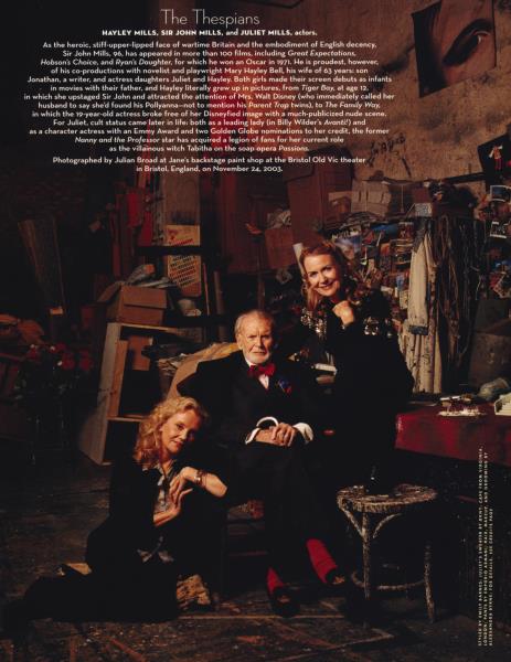 As the heroic, stiff-upper-lipped face of wartime Britain and the embodiment of English decency, Sir John Mills, 96, has appeared in more than 100 films, including Great Expectations, Hobson's Choice, and Ryan’s Daughter, for which he won an Oscar in 1971. He is proudest, however, of his co-productions with novelist and playwright Mary Hayley Bell, his wife of 63 years: son Jonathan, a writer, and actress daughters Juliet and Hayley. Both girls made their screen debuts as infants in movies with their father, and Hayley literally grew up in pictures, from Tiger Bay, at age 12, in which she upstaged Sir John and attracted the attention of Mrs. Walt Disney (who immediately called her husband to say she’d found his Pollyanna—not to mention his Parent Trap twins), to The Family Way, in which the 19-year-old actress broke free of her Disneyfied image with a much-publicized nude scene. For Juliet, cult status came later in life: both as a leading lady (in Billy Wilder’s Avanti!) and as a character actress with an Emmy Award and two Golden Globe nominations to her credit, the former Nanny and the Professor star has acquired a legion of fans for her current role as the villainous witch Tabitha on the soap opera Passions.
