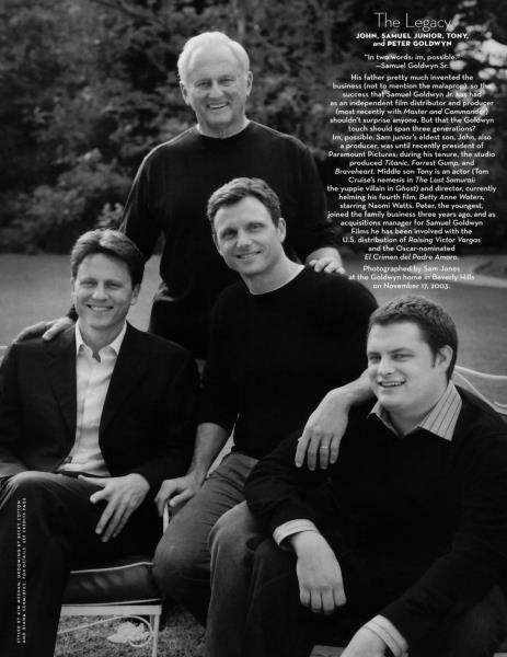 His father pretty much invented the business (not to mention the malaprop), so the success that Samuel Goldwyn Jr. has had as an independent film distributor and producer (most recently with Master and Commander) shouldn’t surprise anyone. But that the Goldwyn touch should span three generations? Im, possible. Sam junior’s eldest son, John, also a producer, was until recently president of Paramount Pictures; during his tenure, the studio produced Titanic, Forrest Gump, and Braveheart. Middle son Tony is an actor (Tom Cruise’s nemesis in The Last Samurai; the yuppie villain in Ghost) and director, currently helming his fourth film, Betty Anne Waters, starring Naomi Watts. Peter, the youngest, joined the family business three years ago, and as acquisitions manager for Samuel Goldwyn Films he has been involved with the U.S. distribution of Raising Victor Vargas and the Oscar-nominated El Crimen del Padre Amaro.