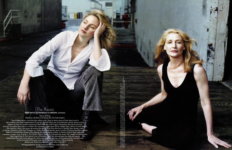 They’ll likely never crack the $20 million club. They’ve done some of their best work in the smallest and most independent of movies. But are there any two actresses whose names you’re happier to see in a credits sequence? Both have the craft to give chameleon-like performances, and yet, no matter how outre or lumpen the character, they never fail to radiate their native wit and smarts. (No surprise: Davis, who grew up across the street from Mira Sorvino in Tenafly, New Jersey, went to Vassar; Clarkson, from New Orleans, is a Yalie.) Both had banner years in 2003—Clarkson lent the surprise heart to a sometimes sitcom-y film playing the bitter, dying mother in Pieces of April, then captured a quieter, lonelier kind of grief in The Station Agent. Davis, in a deceptively quiet role, caught an adulteress's inner tug-of-war in The Secret Lives of Dentists. Next she downplayed her delicate beauty behind bad hair and worse glasses for American Splendor, giving a performance that was both one of the funniest of the year and one of the most humane. Will somebody please cast these two opposite each other A.S.A.P.?