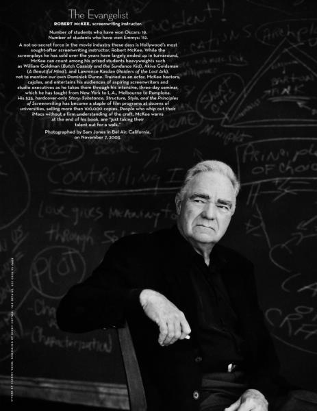 A not-so-secret force in the movie industry these days is Hollywood’s most sought-after screenwriting instructor, Robert McKee. While the screenplays he has sold over the years have largely ended up in turnaround, McKee can count among his prized students heavyweights such as William Goldman (Butch Cassidy and the Sundance Kid), Akiva Goldsman (A Beautiful Mind), and Lawrence Kasdan (Raiders of the Lost Ark), not to mention our own Dominick Dunne. Trained as an actor, McKee hectors, cajoles, and entertains his audiences of aspiring screenwriters and studio executives as he takes them through his intensive, three-day seminar, which he has taught from New York to L.A., Melbourne to Pamplona. His $35, hardcover-only Story: Substance, Structure, Style, and the Principles of Screenwriting has become a staple of film programs at dozens of universities, selling more than 100,000 copies. People who whip out their iMacs without a firm understanding of the craft, McKee warns at the end of his book, are “just taking their talent out for a walk.”