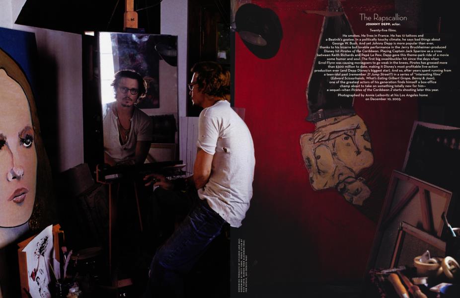 He smokes. He lives in France. He has 12 tattoos and a Beatnik’s goatee. In a politically touchy climate, he says bad things about George W. Bush. And yet Johnny Depp is more popular than ever, thanks to his bizarre but lovable performance in the Jerry Bruckheimer-produced Disney hit Pirates of the Caribbean. Playing Captain Jack Sparrow as a cross between Keith Richards and Pepe Le Pew, Depp gave this theme-park ride of a movie some humor and soul. The first big swashbuckler hit since the days when Errol Flynn was causing moviegoers to go weak in the knees, Pirates has grossed more than $300 million to date, making it Disney’s most profitable live-action production ever (and Depp Disney’s biggest star). And so, after years spent running from a teen-idol past (remember 21 Jump Street?) in a series of "interesting films” (Edward Scissorhands, What's Eating Gilbert Grape, Benny & Joon), one of the greatest actors of his generation finds himself a box-office champ about to take on something totally new for him— a sequel—when Pirates of the Caribbean 2 starts shooting later this year.